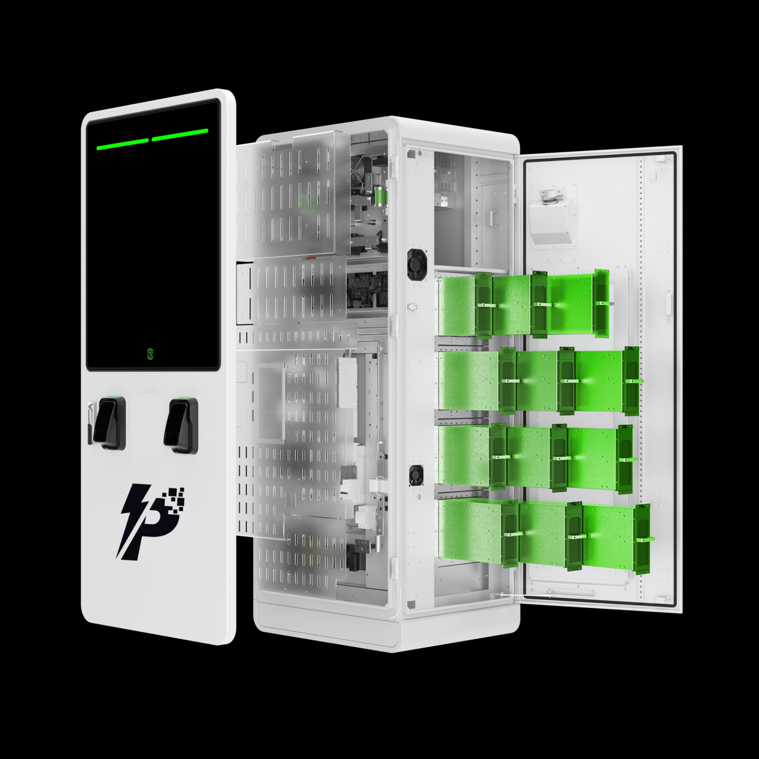A modular DC fast charger for gas stations, dealerships, feets, and more. Features customizable 60-240 kW power output. OCPP compliant. Connectors for every vehicle.